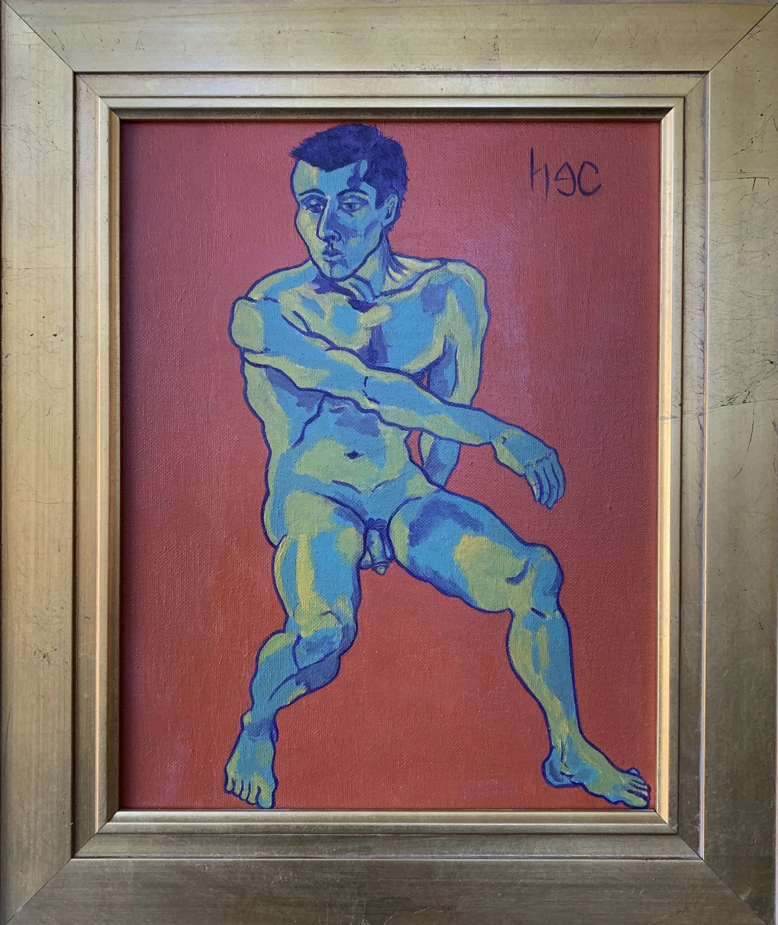 Acrylic painting created with a live model at The Art Students League of New York in 2011. 11"x14" canvas in a 14"x17" blue frame. Picture hangs easily from a hook on the back.