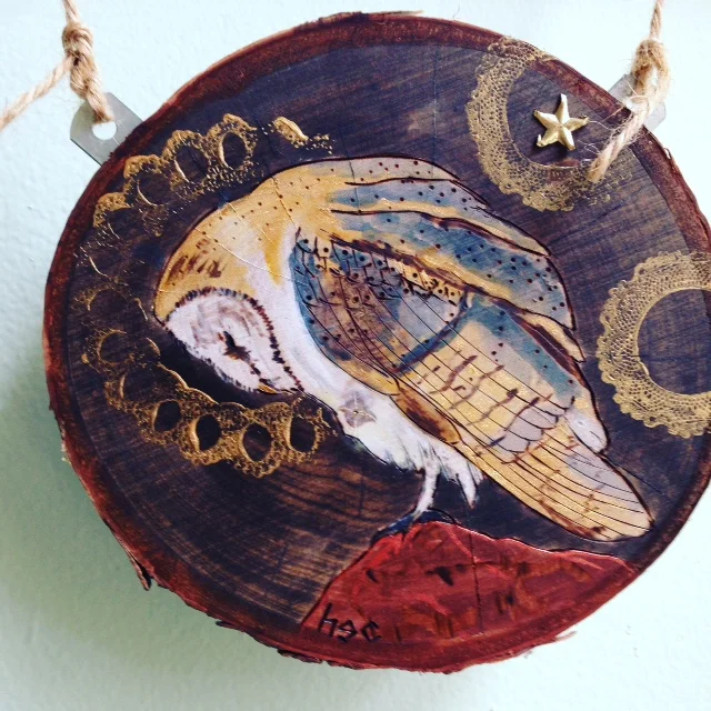 Wood-burned and stained, craft feathers, faux fur and foliage. Hangs easily from secure wire on back. 5”x4”. SOLD!
