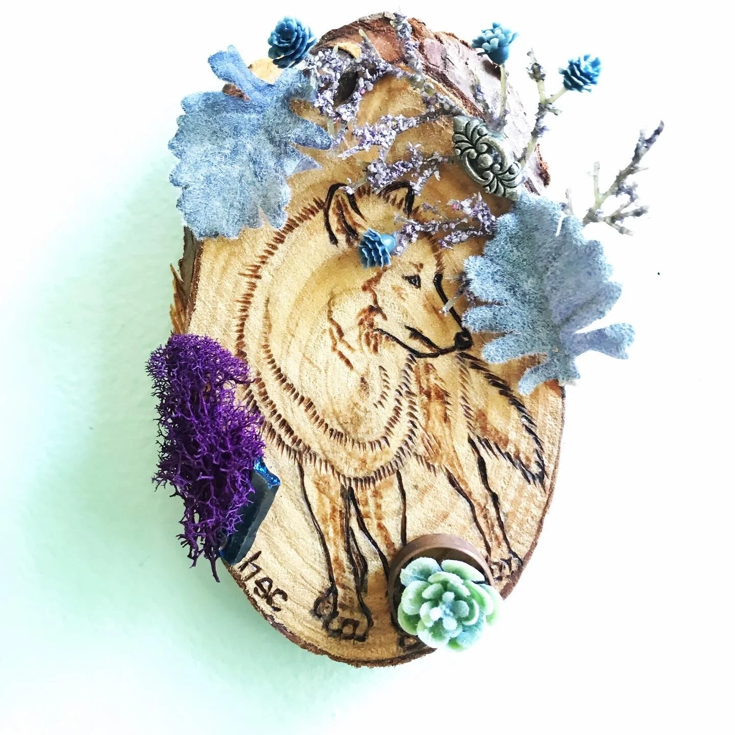 Wood-burned and stained, iridescent blue paint, blue iris quartz, purple moss. Hangs easily from secure wire on back. 4.5”4.75”. SOLD!